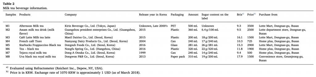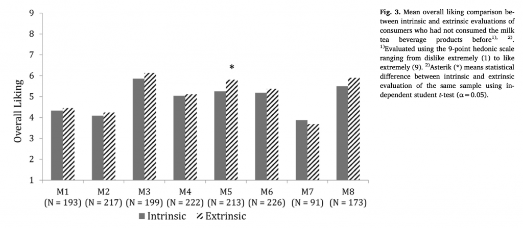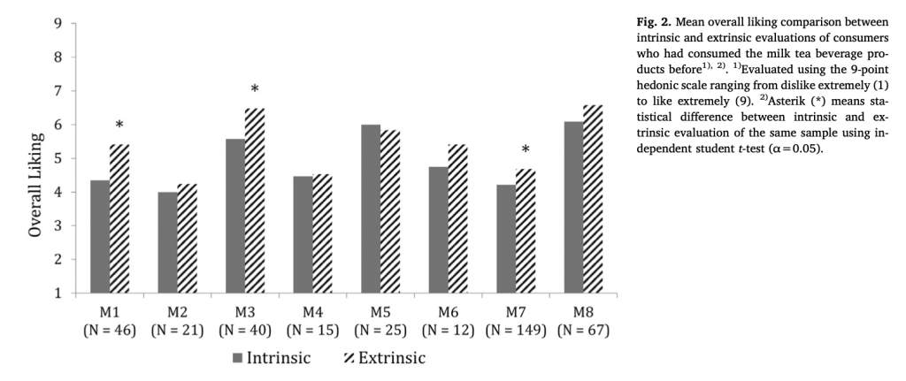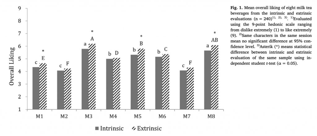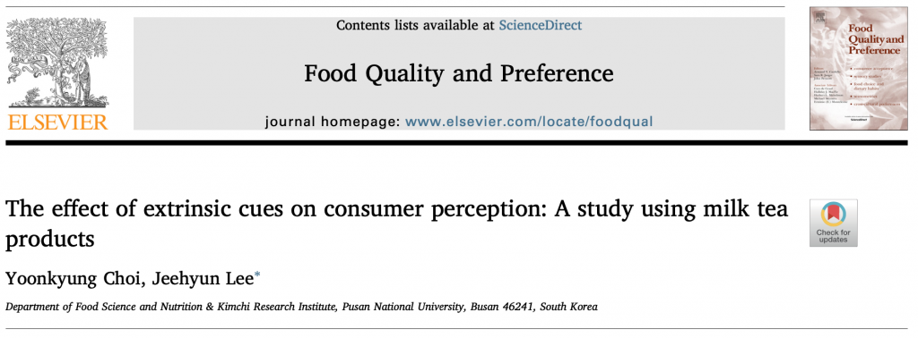 Choi Y , Lee J . The effect of extrinsic cues on consumer perception: A study using milk tea products[J]. Food Quality and Preference, 2018, 71.