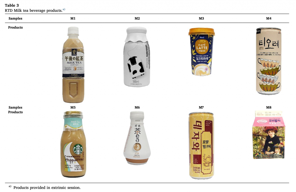 - 第二轮测试饮用与第一轮相同的8款奶茶产品(参照Table3),样品提供顺序与第一轮相反,每个样品同时提供包装。