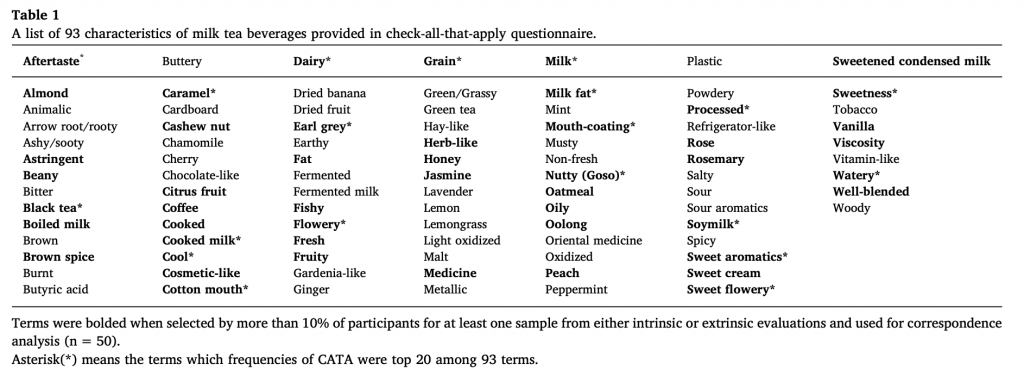 在PM之后,消费者被要求在预先在其他论文中搜索来的106个属性进行选择,最终输出了一个93个属性的词汇列表(参见Table1)。