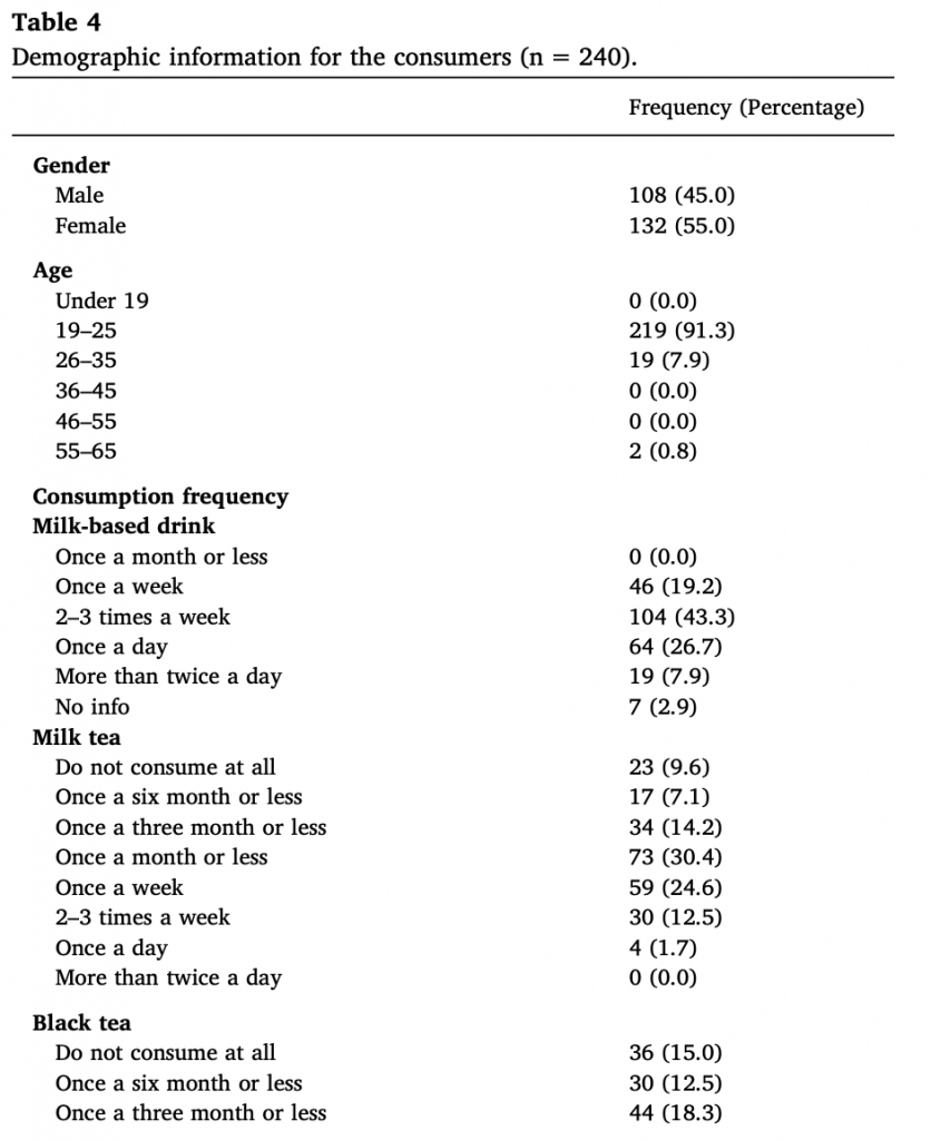 - 第一轮测试消费者共计饮用8款奶茶产品(参照Table3),产品提供顺序根据8*8 Williams Latin Square Design,每个样品提供80mL。