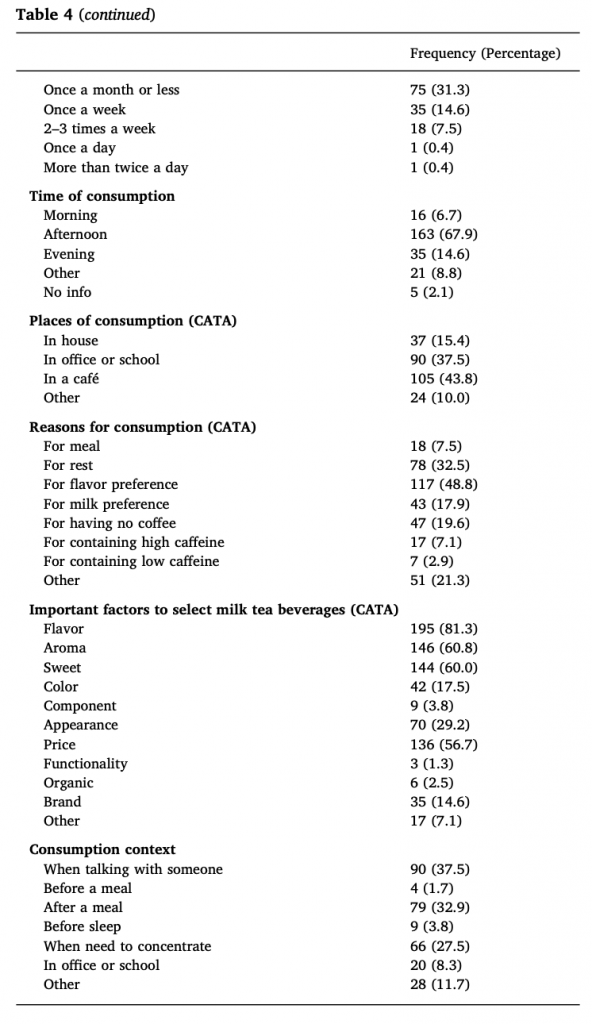 - CATA评价中的风味感知:某些特定属性的熟悉程度会影响消费者在混合风味中的区分能力(本次测试乳类制品的饮用频率要求高于红茶饮用频率,所以消费者对奶味相关属性的区分度更高);当消费者在CATA评价中选择属性词汇时,他们更倾向于选择那些他们熟悉的词汇。