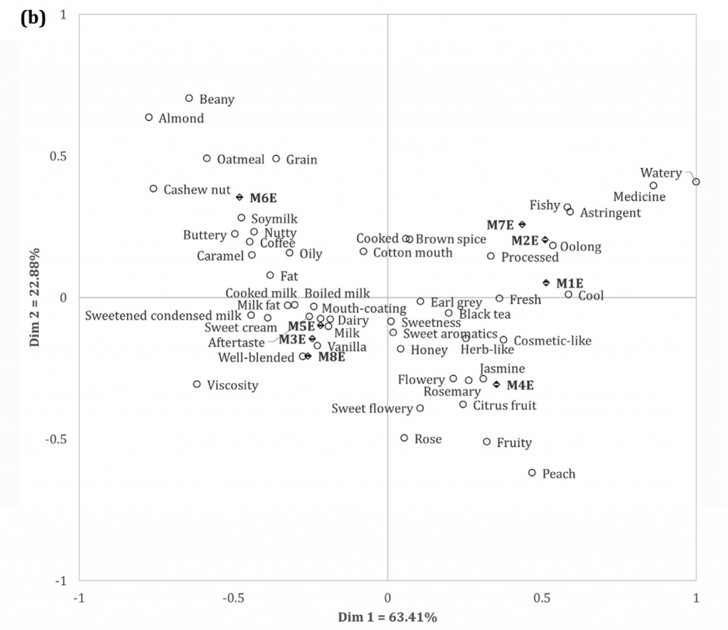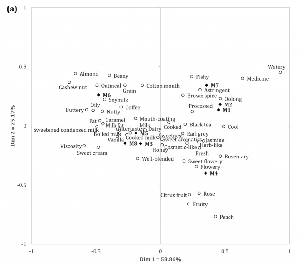 使用筛选后的50个词汇来进行对应分析(Correspondence Analysis)后可发现,主要属性如甜味、奶味、红茶味基本都落在原点为止。在两轮测试中,Dim1基本与涩味(astringent)、凉感(cool)、药味(medicine)、乌龙茶味(Oolong)、桃子味(Peach)、迷迭香味(Rosemary)、稀薄无味的(watery)正相关,与巴旦木味(almond)、黄油味(buttery)、腰果味(Cashew nut)、脂肪感(Fat)、燕麦味(Oatmeal)、油感(Oily)、豆奶味(Soymilk)、浓缩甜牛奶味(Sweetened condensed milk)、甜奶油(Sweet cream)和黏度(Viscosity)负相关。Dim2基本与巴旦木味(Almond)、豆腥味(Beany)、腰果味(Cashew nut)、鱼腥味(Fishy)、谷物味(Grain)、药味(Medicine)、燕麦味(Oatmeal)、稀薄无味的(watery)正相关,与柑橘水果味(citrus fruit)、水果味(Fruity)、桃子味(Peach)和玫瑰味(Rose)负相关。