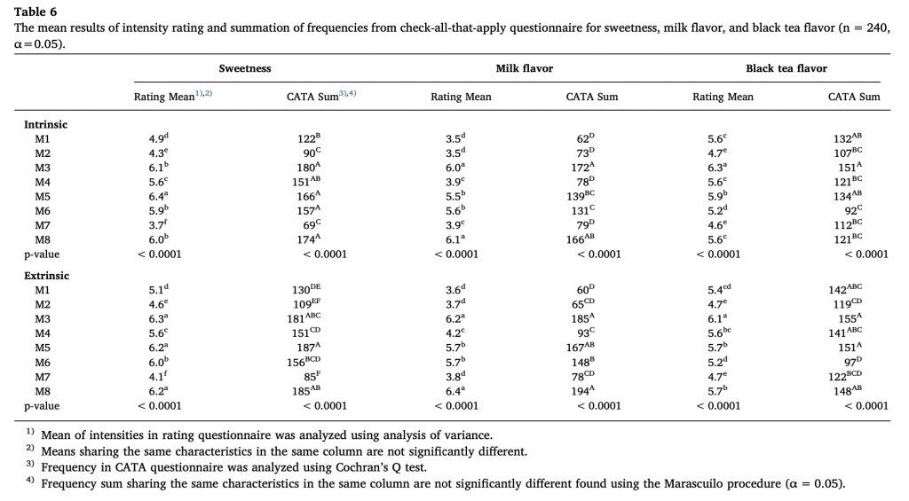 对三个主要属性(甜味、奶味和红茶味)的强度打分及CATA属性选择中选择该3个属性的频数进行比较,结果如Table 6所示。强度某些情况下与选择频数有相关性,如甜味强度平均分较高的产品CATA选择频数也较高;奶味频数较高的产品CATA选择频数也较高。强度平均分在4.6-5.5之间的时候,CATA选择频数百分比基本在44.6%-77%之间。但是,红茶味中,消费者认为M6的红茶味强度为5.2,但是选择频数却仅为38.3%(Intrinsic)和40%(Extrinsic)。